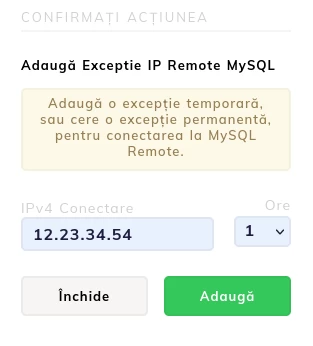 La adición temporal se puede configurar para un mínimo de 1 hora y un máximo de 24 horas, con la posibilidad de cancelación desde la cuenta si es necesario, mientras que para la permanencia se abrirá automáticamente un ticket de asistencia desde la cuenta del cliente, quedando la implementación sujeta a la confirmación del departamento de soporte de Hostico, si el motivo de la solicitud es justificado.