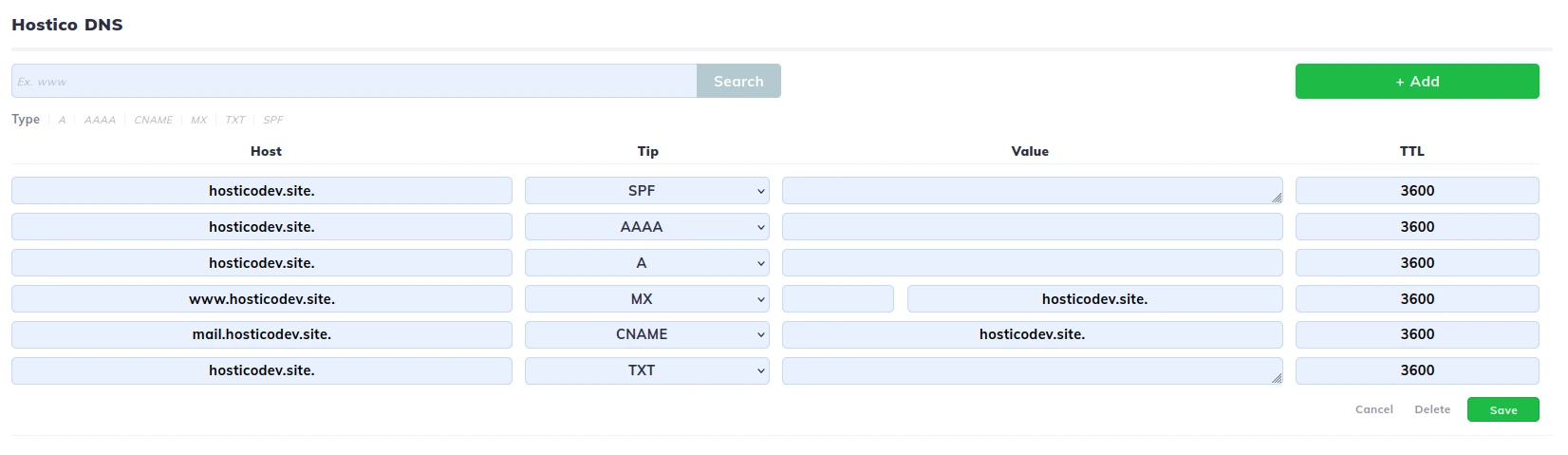 La nueva funcionalidad desarrollada en la cuenta de cliente Hostico ofrece a los usuarios la posibilidad de configurar y modificar de forma independiente los siguientes tipos de registros DNS: