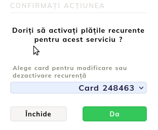 - La nueva ventana abierta nos pide seleccionar una tarjeta guardada en la cuenta. Seleccionamos la tarjeta de la que queremos que se retire el monto y hacemos clic en SÍ. Si la operación fue exitosa, se mostrará el mensaje "El pago recurrente ha sido activado".