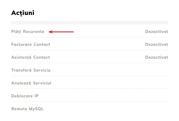 - La sección de Servicios muestra los paquetes de hosting activos. Haz clic en el servicio para el cual deseas activar los pagos recurrentes, y se abrirá la página de gestión del servicio. En la ventana de gestión, en la sección de Acciones, está disponible la opción para activar los pagos recurrentes.