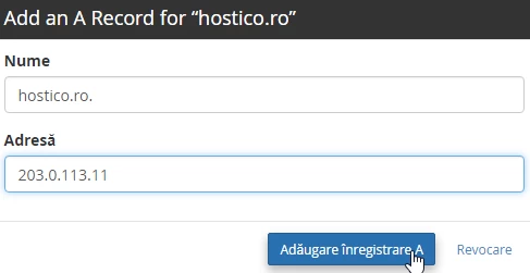- En el campo Nombre, añadiremos el nombre de dominio para el cual estamos agregando el registro A (hostico.ro) y en el campo Dirección, añadiremos la dirección IP IP (IPv4) del servidor que aloja el dominio 203.0.113.11.
