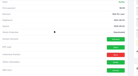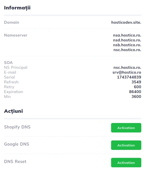 En el lado derecho de la pantalla se encuentra una ventana dedicada a mostrar información general sobre las configuraciones DNS activas para el dominio. En caso de que desee redirigir la zona DNS hacia una plataforma externa, como Shopify o Google, esto se puede realizar fácilmente a través del menú de acciones disponible en la interfaz